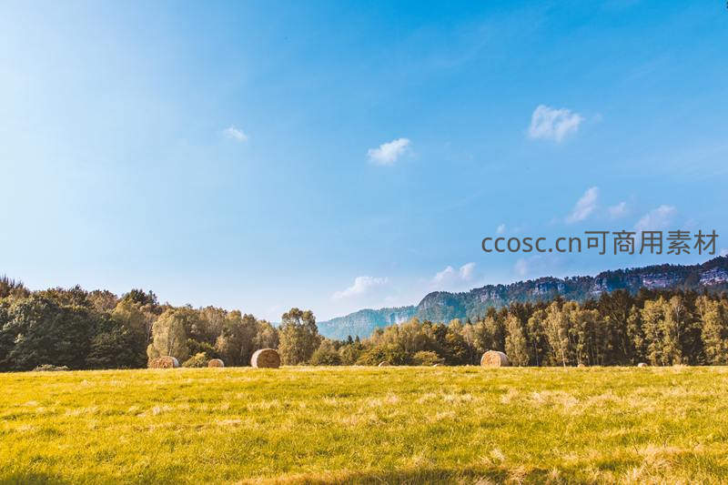 广阔的金色草场上散落着圆滚滚的干草捆,背景是郁郁葱葱的森林和层叠的远山,湛蓝天空万里无云,洋溢着丰收季节的宁静与富足。
