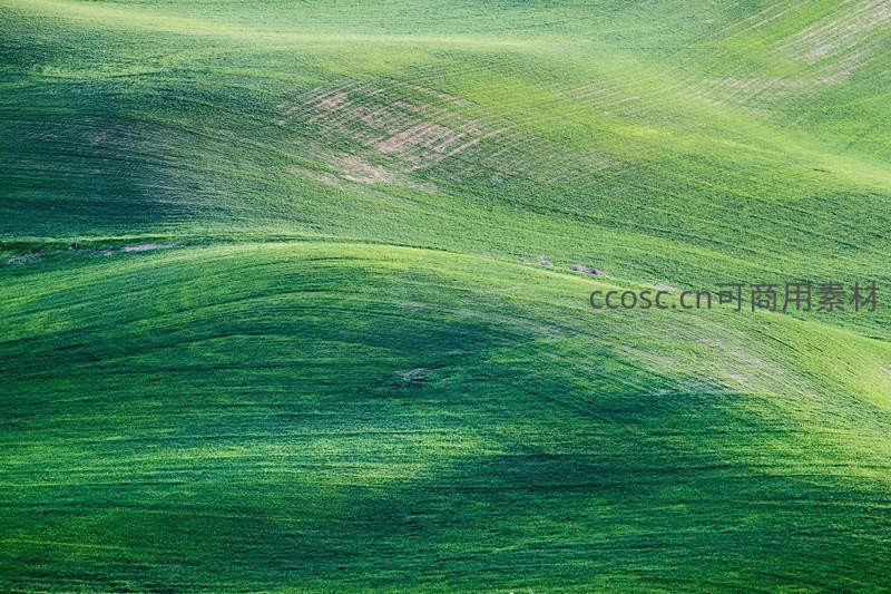 连绵起伏的绿色田野在阳光下泛起波浪,清晰的耕作痕迹勾勒出大地的肌理,展现农业与自然的和谐之美。