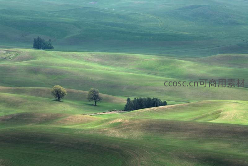 薄雾笼罩的绿色波浪丘陵