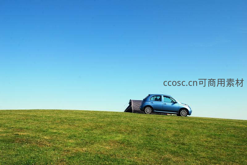 一辆蓝色小车停驻在辽阔的绿色草坡上,旁边支起的帐篷与无垠蓝天相映成趣,是逃离喧嚣、拥抱自然的理想之地。