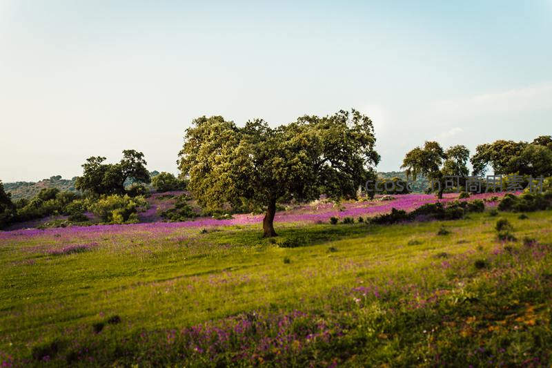 一片绚烂的紫色花海铺展在起伏的绿色山坡上,一棵枝繁叶茂的大树傲然独立其中,构成一幅色彩斑斓、充满诗意的自然图景。