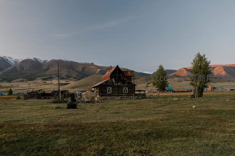 一座质朴的木制房屋坐落在广袤草原中央,背后是起伏的彩色山丘与远处白雪覆盖的山峰,呈现出人与自然和谐共处的诗意田园景象。