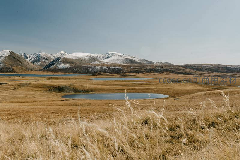 几片静谧湖泊点缀在广袤的高原草甸上,前景干草随风轻舞,背景雪峰苍茫,展现高寒地区独特的生态与地貌。