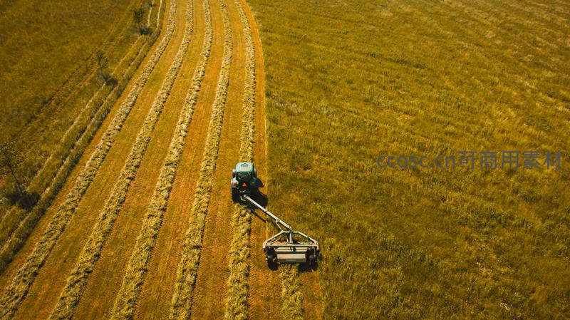 从高空俯瞰,一台绿色收割机在广袤的金色田野上划出整齐的线条,展现现代农业的效率与大地的壮美。