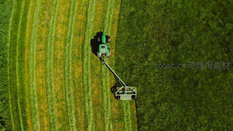 无人机视角下绿野上的拖拉机