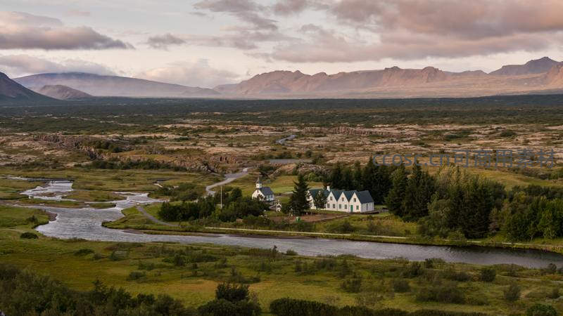 一条蜿蜒的河流穿过开阔的河谷,一座洁白的小教堂静静伫立,背景是连绵起伏的山脉和多云的天空,景色如画。