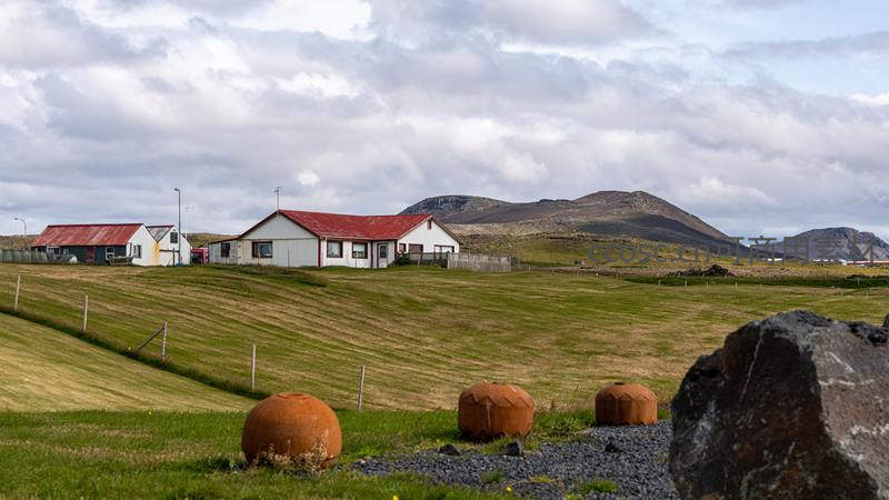 几栋带有红色屋顶的房屋坐落在起伏的绿色草原上,远处是典型的火山地貌山丘,前景点缀着锈蚀的金属球和巨石。