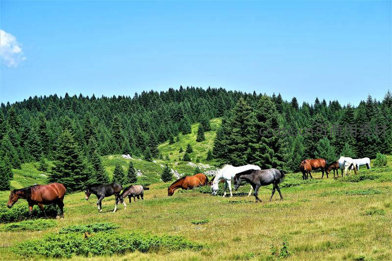 群马悠然食青草,松林环抱绿山坡