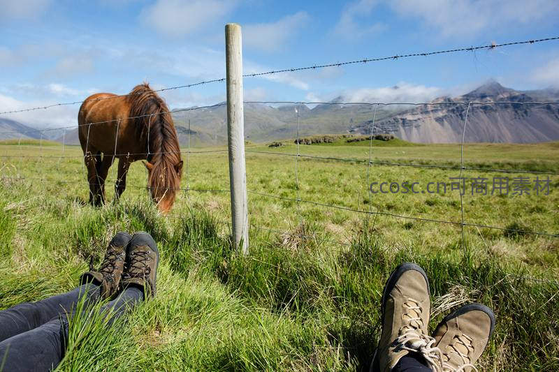 从第一视角拍摄,双脚穿着徒步鞋躺在绿草地上,前方铁丝网内一匹棕马正在吃草,远处是连绵起伏、云雾缭绕的壮丽山脉。