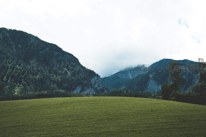绿茵牧场对青山,云雾缭绕显幽深