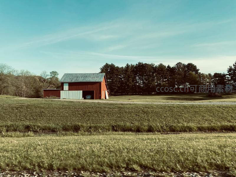 一座经典的红色谷仓矗立在起伏的绿色草地上,背景是清澈的蓝天和茂密的树林,展现出一幅宁静祥和的乡村田园画卷。