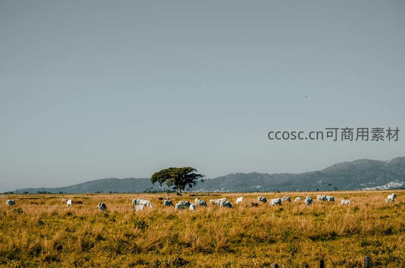 一片金黄色的田野中,一棵孤零零的大树傲然挺立,周围是成群的白色牛只在悠闲吃草,远处是朦胧的山脉,天空澄澈高远。