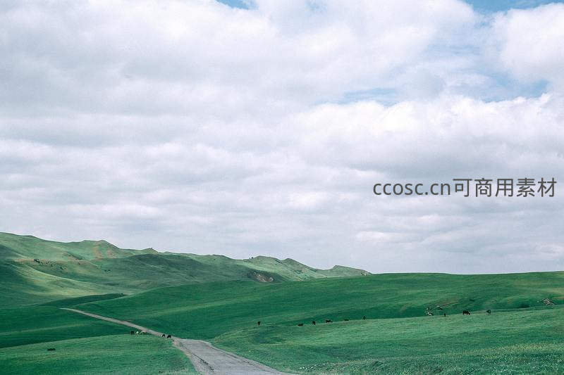 一条蜿蜒的土路穿过一望无际的碧绿草原,几头牛羊散落在起伏的山丘上,头顶是厚厚的云层,整个画面充满了辽阔与宁静。