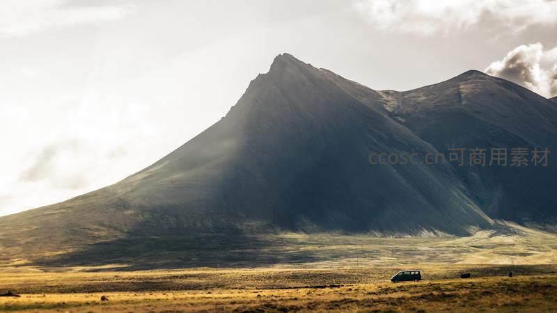 孤车穿行于雄伟山峦的旷野之间