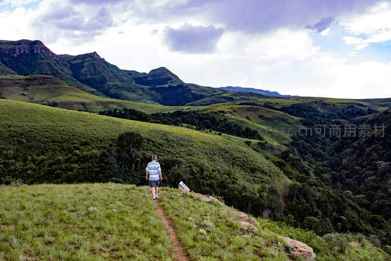 一位行者背对镜头,沿着青翠山脊的小径前行,远眺连绵起伏的山脉与变幻云海,感受大自然的壮阔与宁静。