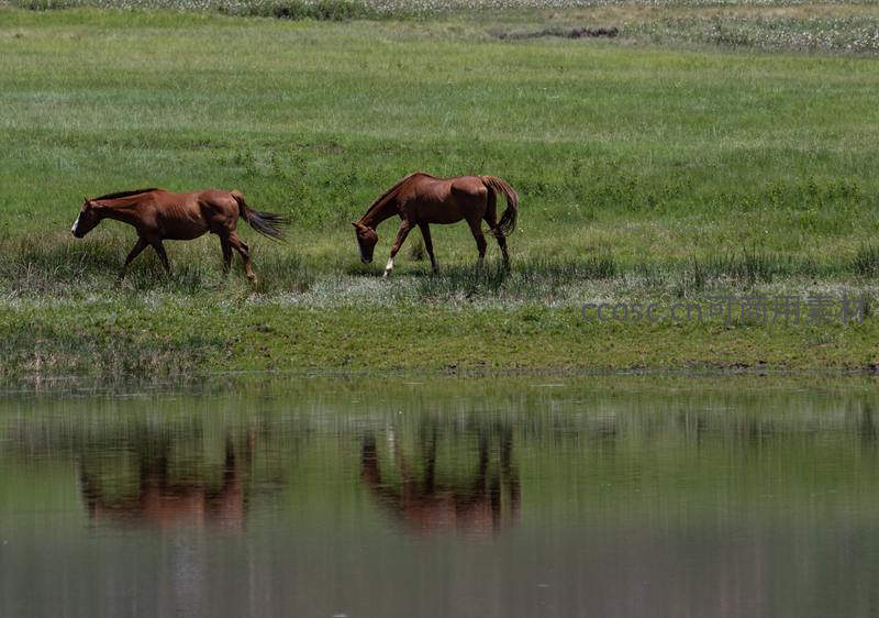 湖畔双骏缓步饮水倒影如镜面般清晰
