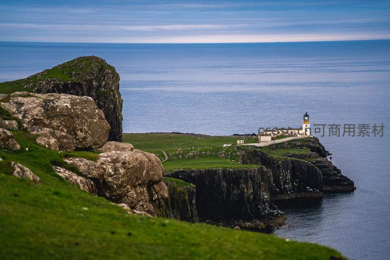 一座白色灯塔矗立在陡峭的绿色悬崖之上,俯瞰着无垠的蔚蓝海洋,构成一幅壮丽而宁静的海岸风光画卷。
