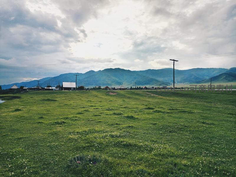 一片广阔的绿色草原延伸至远方,几座房屋散落其间,背景是连绵起伏的青山和厚重的云层,氛围宁静悠远。