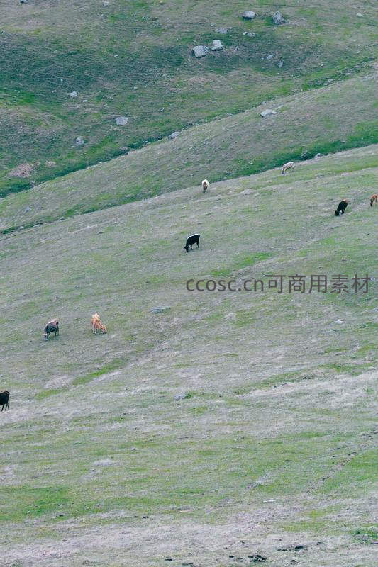 在起伏的绿色山坡上,几头牛儿分散开来,低头安静地啃食青草,构成了一幅恬静、质朴的田园牧歌图景。