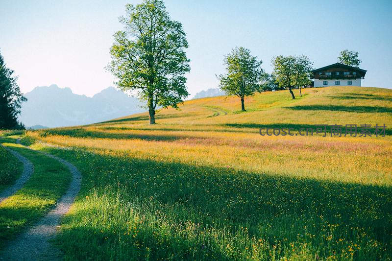 金色的阳光倾泻在起伏的草坡上,几棵孤树和一座小屋静静伫立,长长的影子拉伸在草地上,充满诗意与宁静。