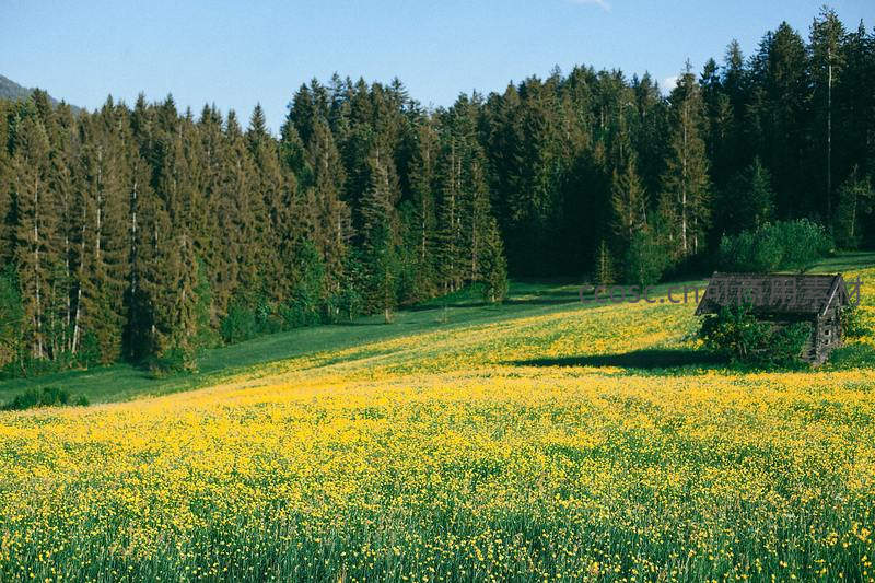 一片无垠的金黄色花海在阳光下绽放,远处是茂密的深绿针叶林,林边一座古朴小屋静静伫立,构成一幅宁静和谐的田园画卷。