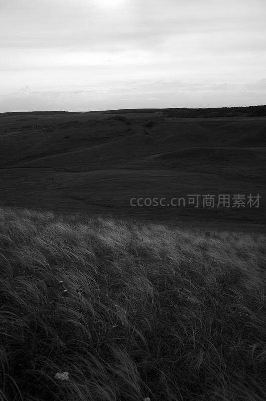 以黑白影调呈现的草原丘陵,前景草丛纹理清晰,远景层次分明,光影对比强烈,赋予画面一种苍凉、静谧且充满艺术感的视觉体验。