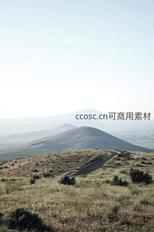 一条土路从前景草地延伸至远方圆润的山丘,背景是朦胧的地平线与淡蓝天空,展现了一片人迹罕至、开阔寂寥的自然地貌。