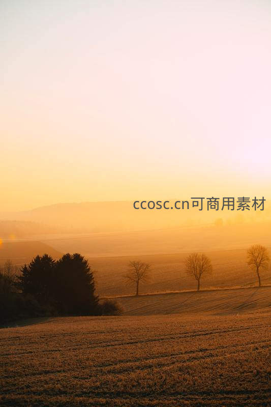 温暖的晨光穿透薄雾,将广袤的田野染成一片金黄,几棵孤树的剪影点缀其间,营造出宁静而梦幻的秋日清晨景象。
