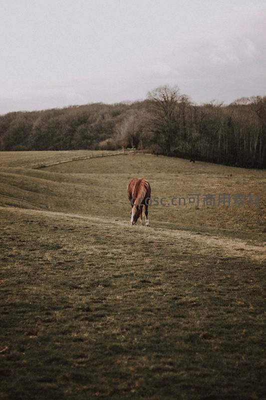 一匹棕色的马独自站在广阔的田野中低头吃草,远处是连绵的树林和阴沉的天空,氛围宁静而辽阔。