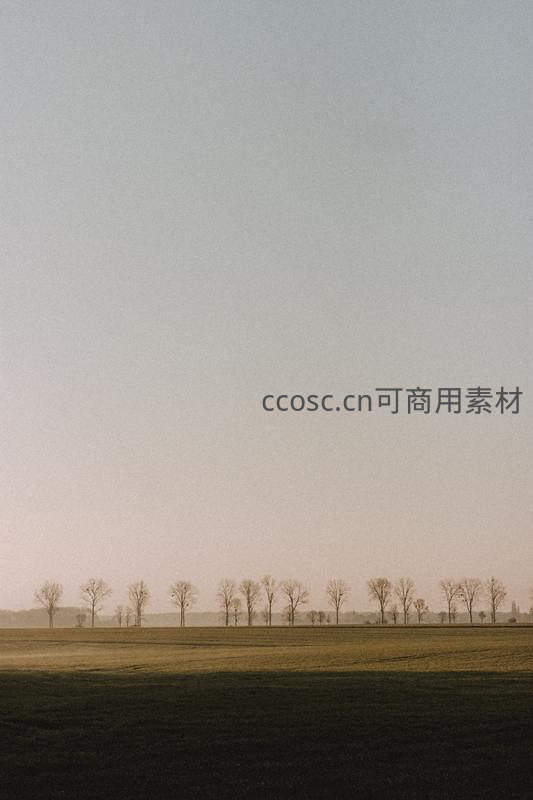黄昏时分,一片空旷的田野上,一排光秃的树木形成优美的剪影,与柔和的天空构成宁静而诗意的画面。