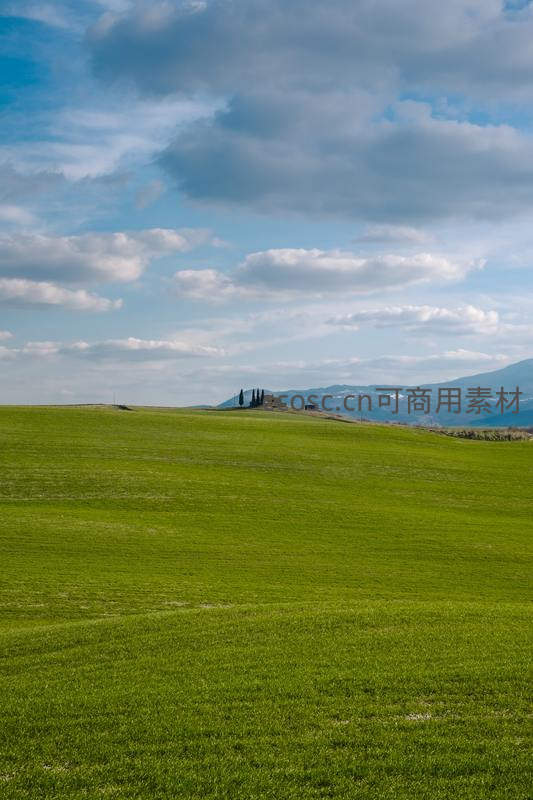 广阔无垠的翠绿草原延伸至天际,点缀着几棵孤树和远方的山脉,头顶是飘逸的白云,令人心旷神怡。