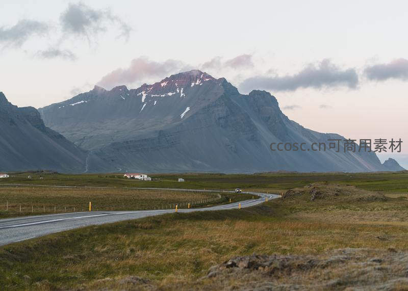 一条蜿蜒的公路穿过广袤的苔原,通向远方雄伟的雪山,路边零星房屋点缀,展现冰岛壮丽的自然景观。