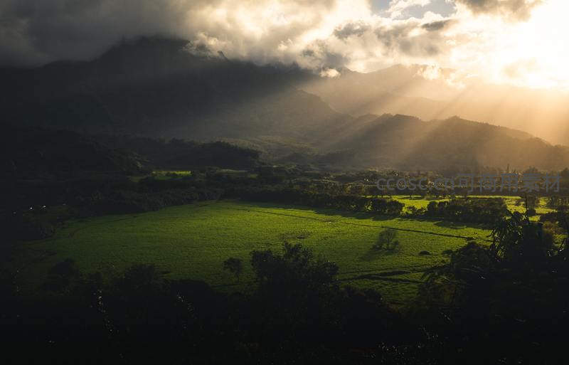 金色的阳光如利剑般刺破厚重云层,倾泻在葱郁的山谷与田野上,形成震撼人心的丁达尔效应美景。