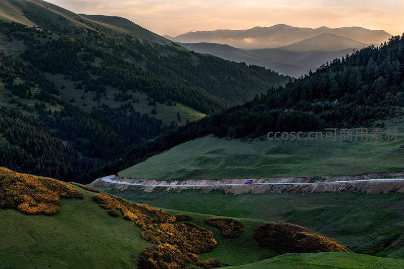 一条蜿蜒的盘山公路穿梭在连绵起伏的绿色山峦间,远处层峦叠嶂,一辆小车行驶其间,气势恢宏。