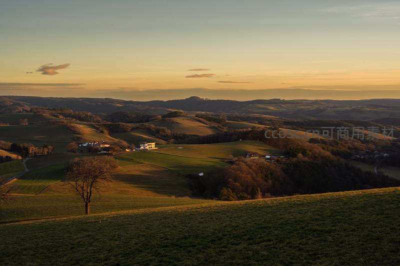 夕阳的余晖温柔地洒在起伏的绿色山丘上,远处村落静谧安详,整个画面弥漫着温暖而宁静的黄昏氛围。
