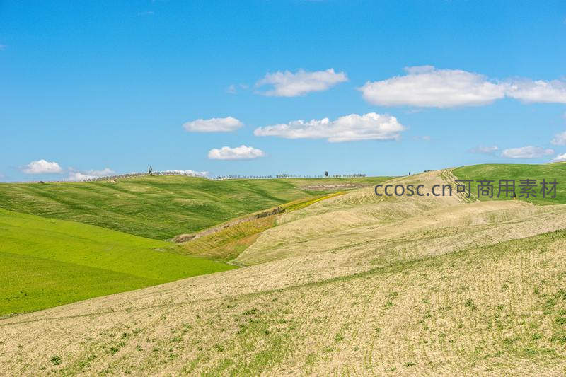明媚春光下,连绵起伏的丘陵披上新绿,部分土地仍显金黄,与蔚蓝天空和朵朵白云相映成趣,生机盎然。