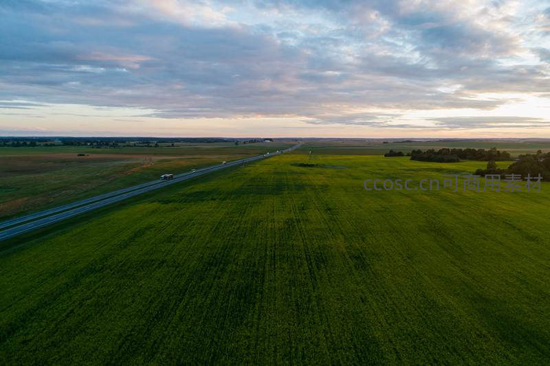 一条笔直的公路如丝带般穿越广阔的绿色原野,在黄昏柔和的光线下延伸向远方,充满旅途的诗意。