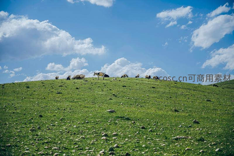 碧绿的山坡上,一群牛儿悠闲地吃着青草,头顶是湛蓝的天空和朵朵白云,构成一幅宁静美好的牧场画卷。