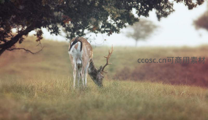 晨雾弥漫的林间空地上,一只雄鹿正低头专注地啃食青草,其身后是模糊的树影和温暖的晨光,静谧而生动。