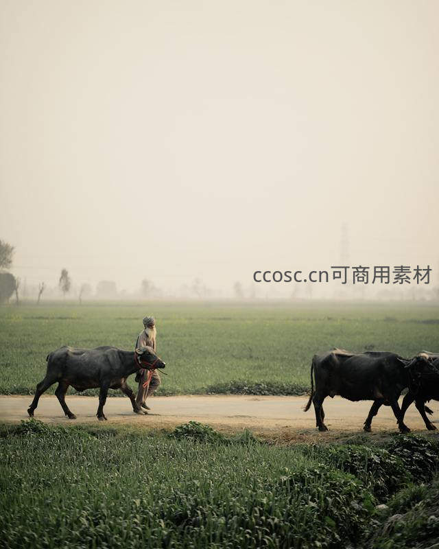 农夫牵水牛走过田野乡间小路
