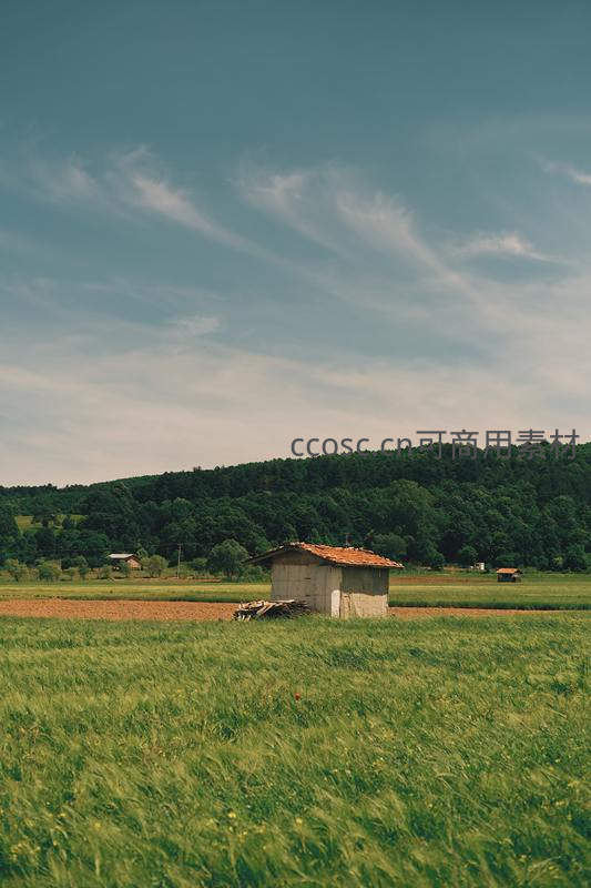 一幢孤零零的小屋伫立在无垠的绿色麦田中,背景是苍翠的远山,营造出一种宁静而略带孤寂的田园氛围。