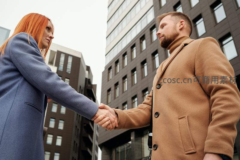 一男一女身着正装,在现代都市建筑群背景下握手,象征商业合作的成功达成,传递专业与信赖感。