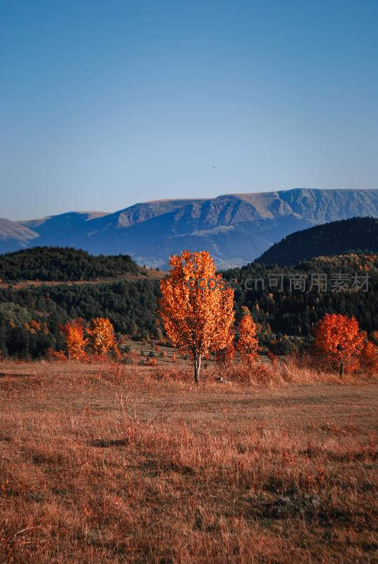 深秋时节,山坡上的树木披上火红的外衣,与远处青黛色的山脉和湛蓝的天空形成鲜明对比,美不胜收。