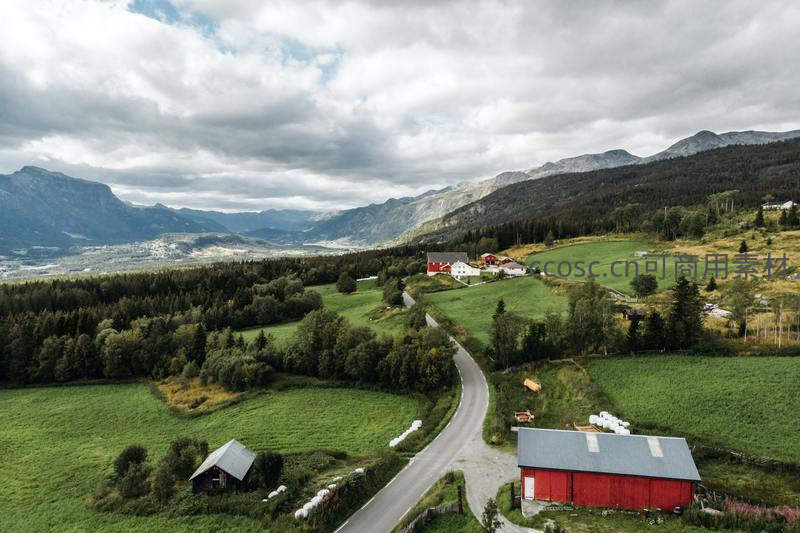 从高空俯瞰,蜿蜒山路穿过翠绿山谷,红色农舍点缀其间,构成一幅宁静和谐的田园画卷。