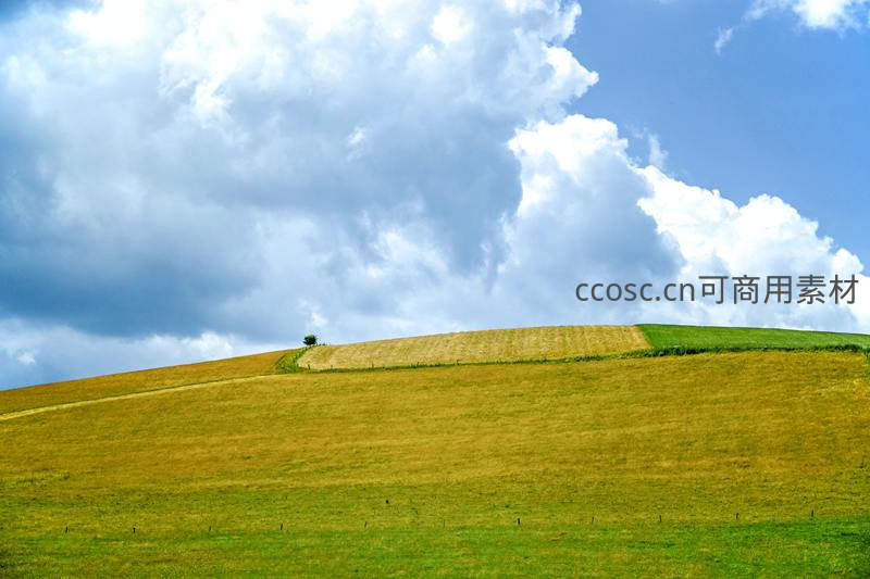 起伏的金色麦浪在蔚蓝天空与蓬松白云的映衬下,构成一幅宁静而壮美的田园画卷。