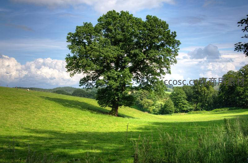 一棵枝繁叶茂的大树静静伫立在起伏的翠绿草坡上,头顶是湛蓝天空与朵朵白云,阳光洒落,构成一幅宁静祥和的田园画卷。