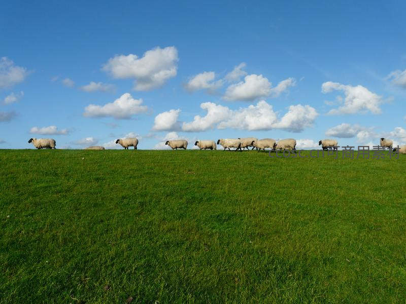 一群洁白的绵羊悠闲地行走在翠绿山坡上,身后是无垠的蓝天与蓬松白云,画面充满田园诗意与自然和谐的宁静氛围。