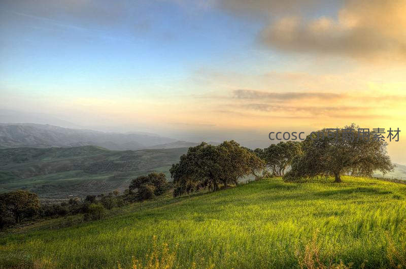 金色的晨曦温柔地洒在起伏的绿色山坡上,几棵古老的橡树静静伫立,远方是薄雾笼罩的层层山峦,景色宁静而壮美。