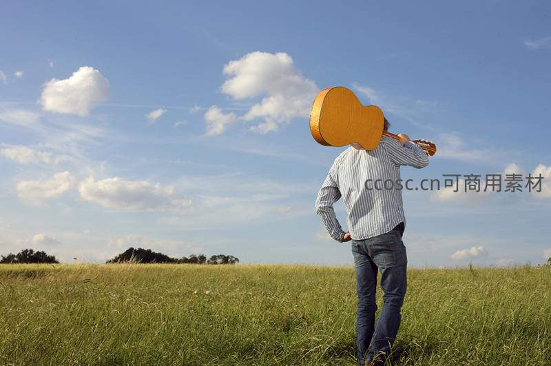 一位背着吉他的男子独自站在金黄的麦田中,仰望蓝天白云,身影充满自由与浪漫气息,仿佛正准备开启一场音乐之旅。