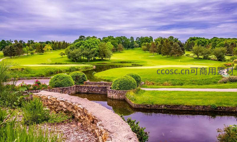 翠绿的高尔夫球场被清澈水道环绕,石桥连接两岸,远处树木葱郁,天空云卷云舒,营造出宁静优美的自然休闲氛围。